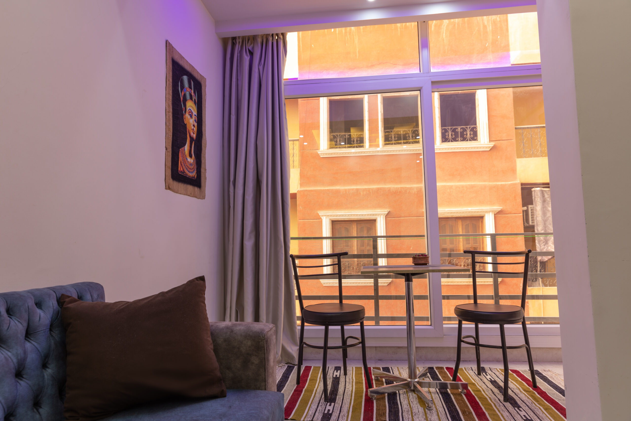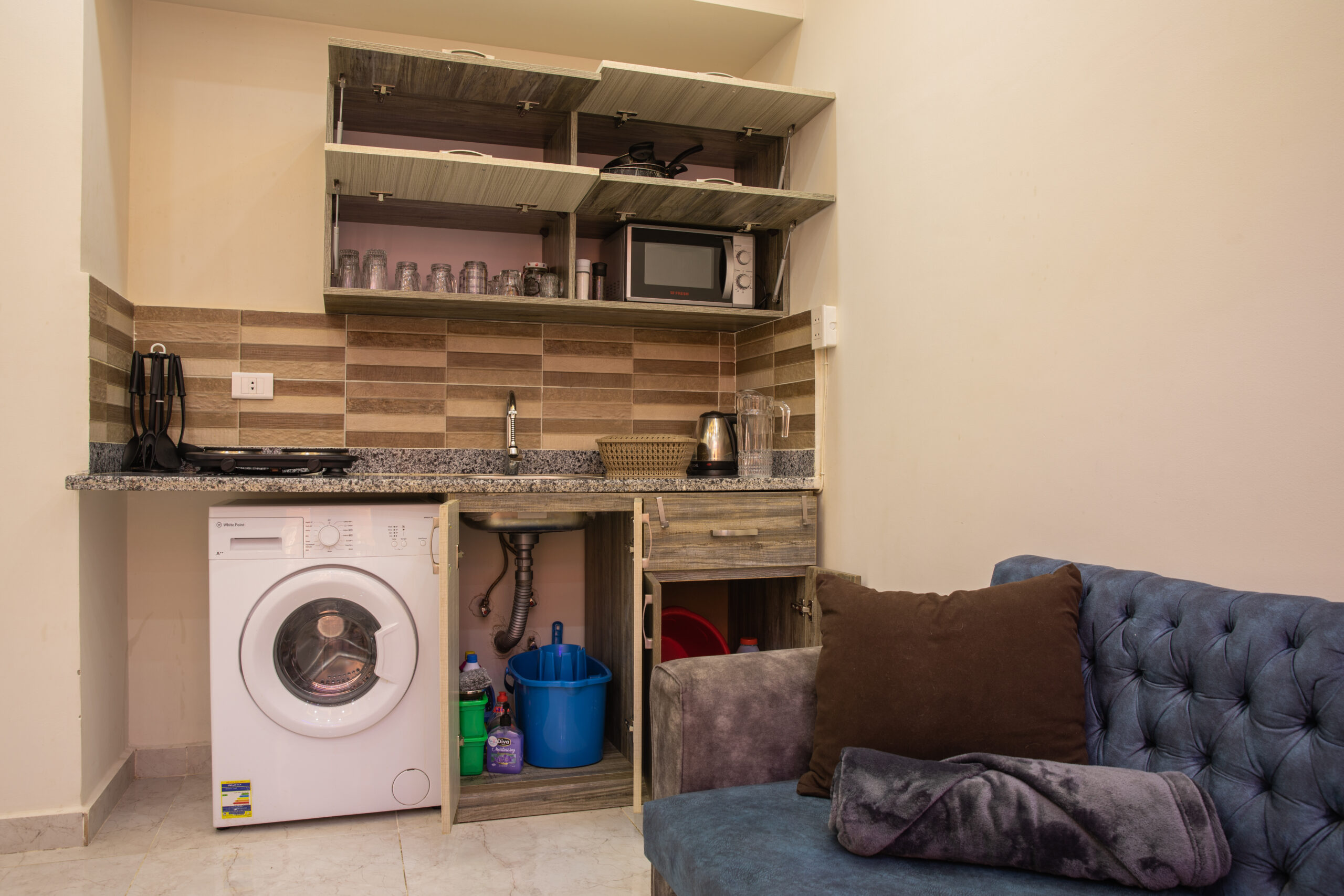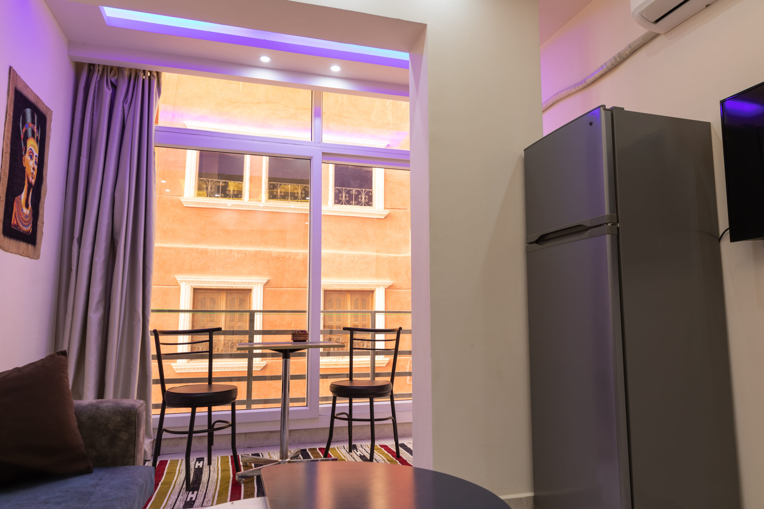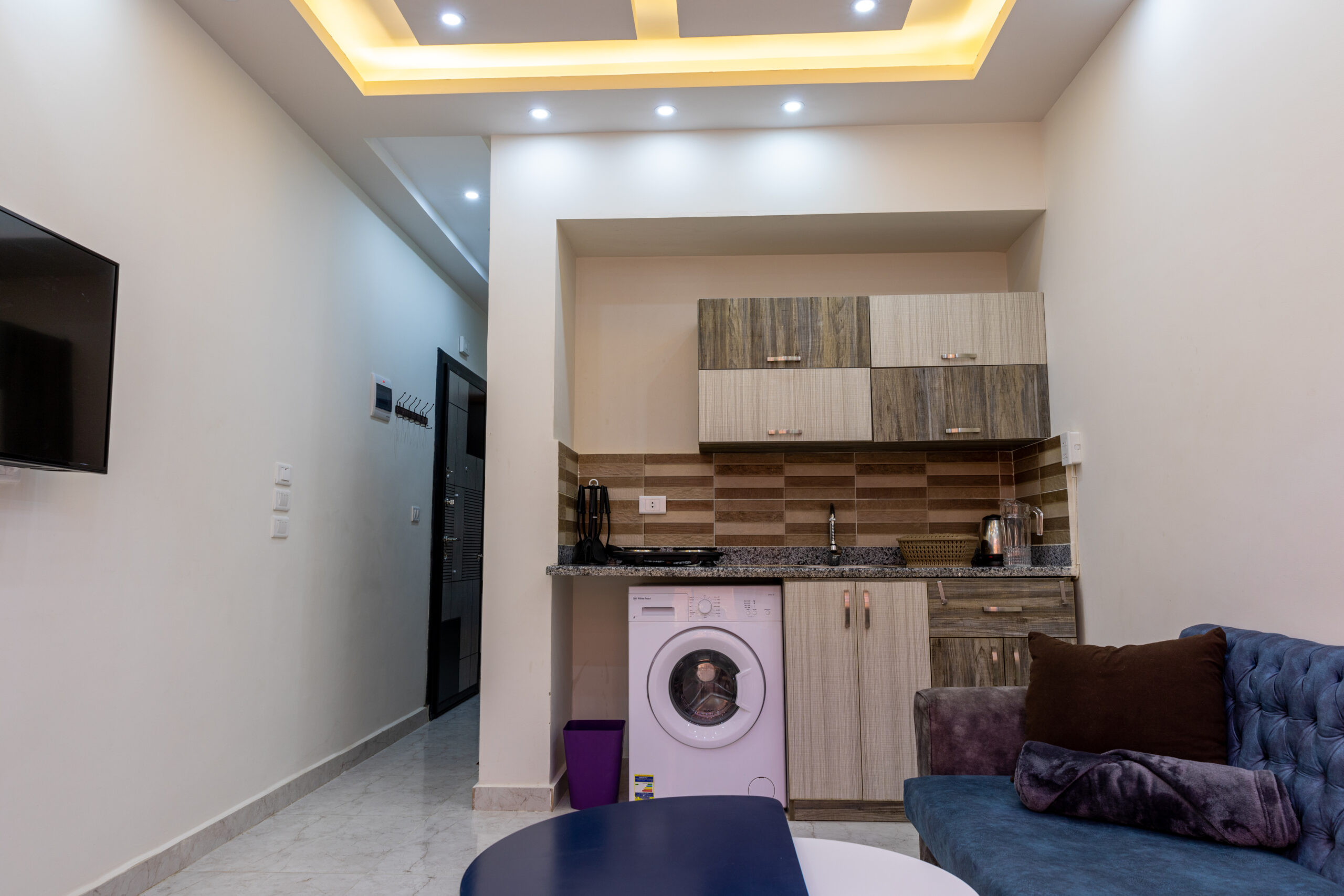 Comfortable air-conditioned apartment with a bedroom, living room and fully equipped kitchen. Ideal for couples and solo travelers, just a few steps from Orange Beach, the marina and the center of Hurghada. Accessories that come as standard: electric stove, air conditioning, refrigerator, microwave, washing machine, heater, kettle, TV, vacuum cleaner